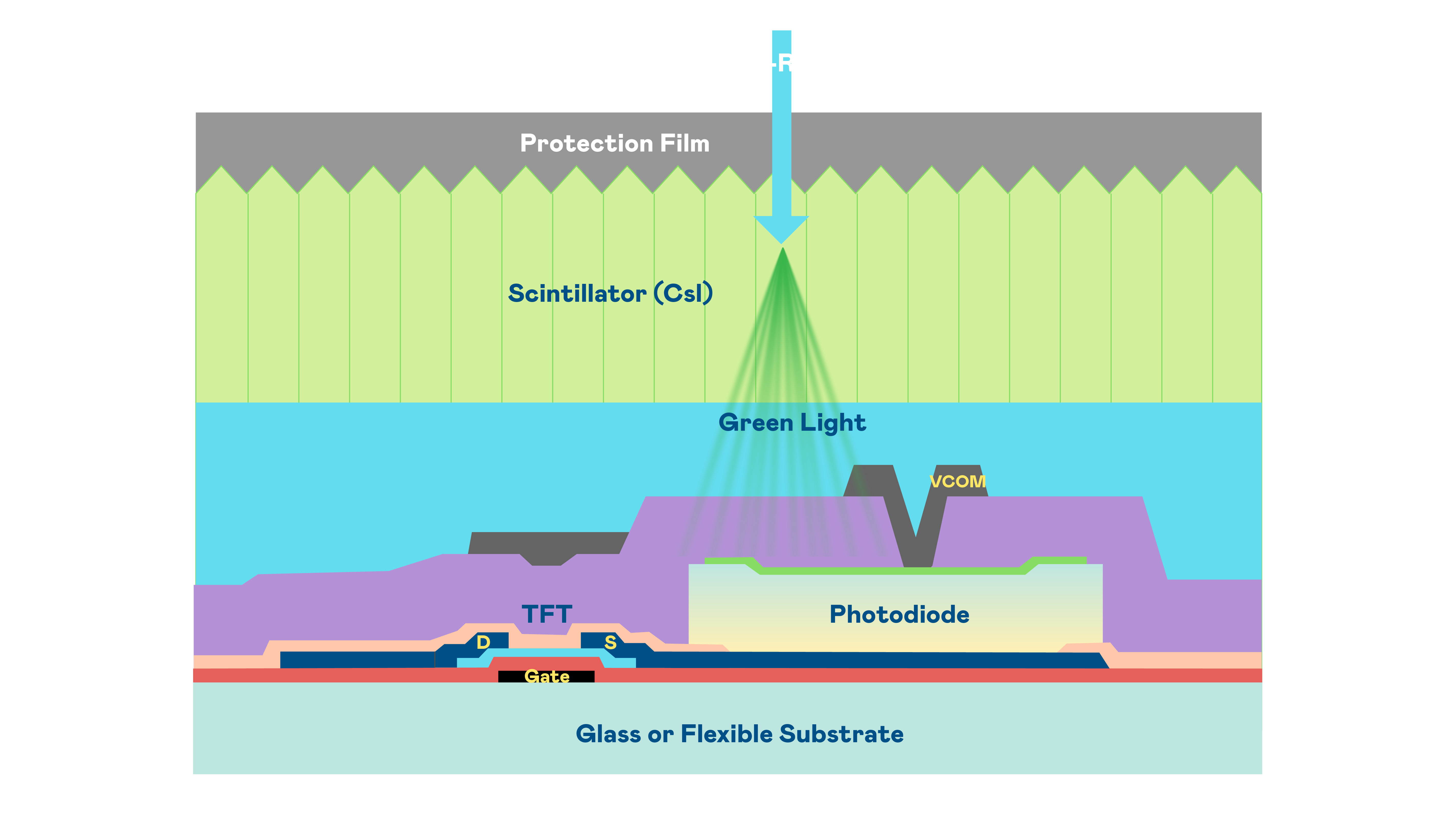 5001拉斯维加斯的X光影像感测阵列使用薄膜电晶体 (TFT) 作为每个像素的读取开关,搭配光电二极体(Photodiode)的光电转换元件,用以感测X光影像讯号。